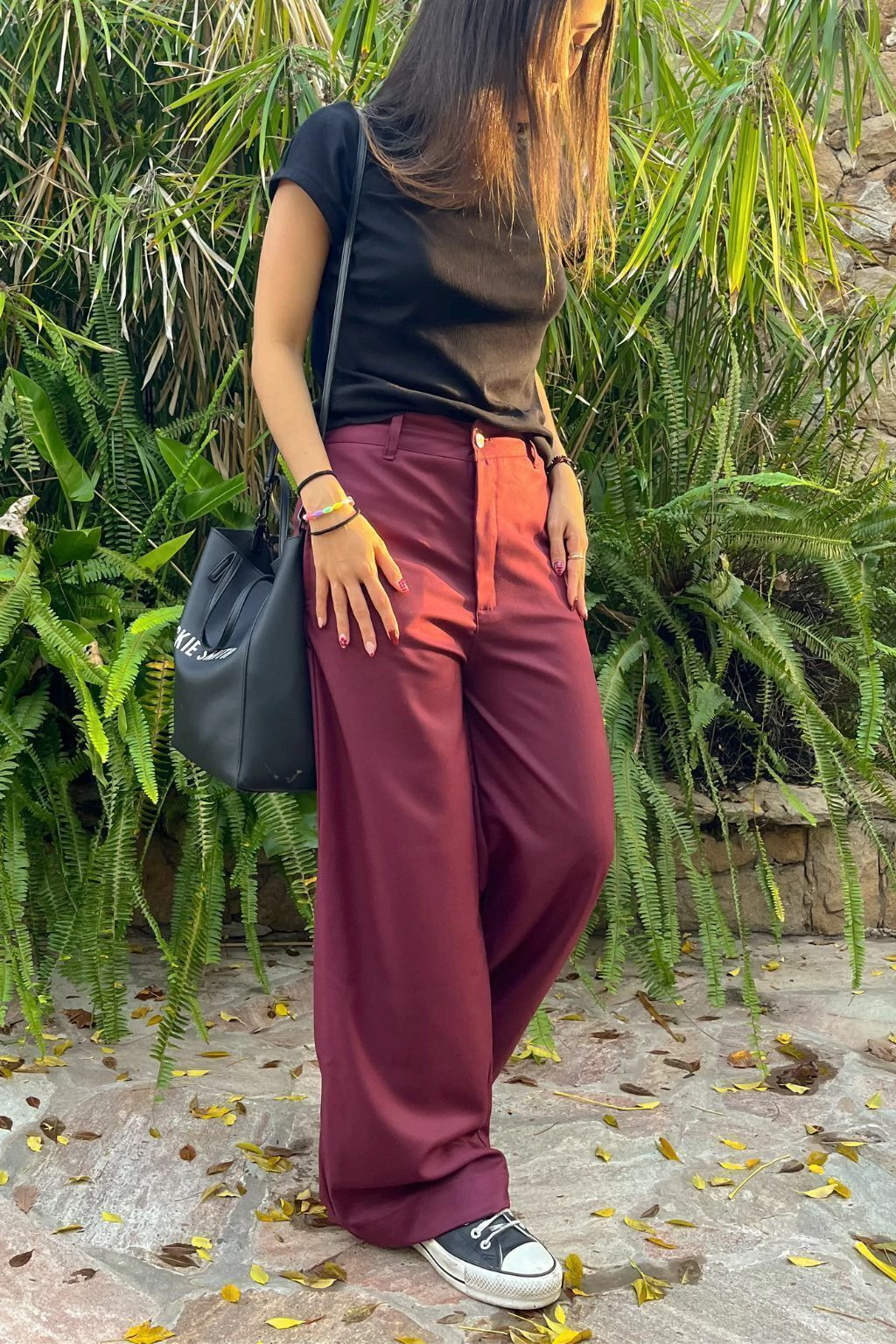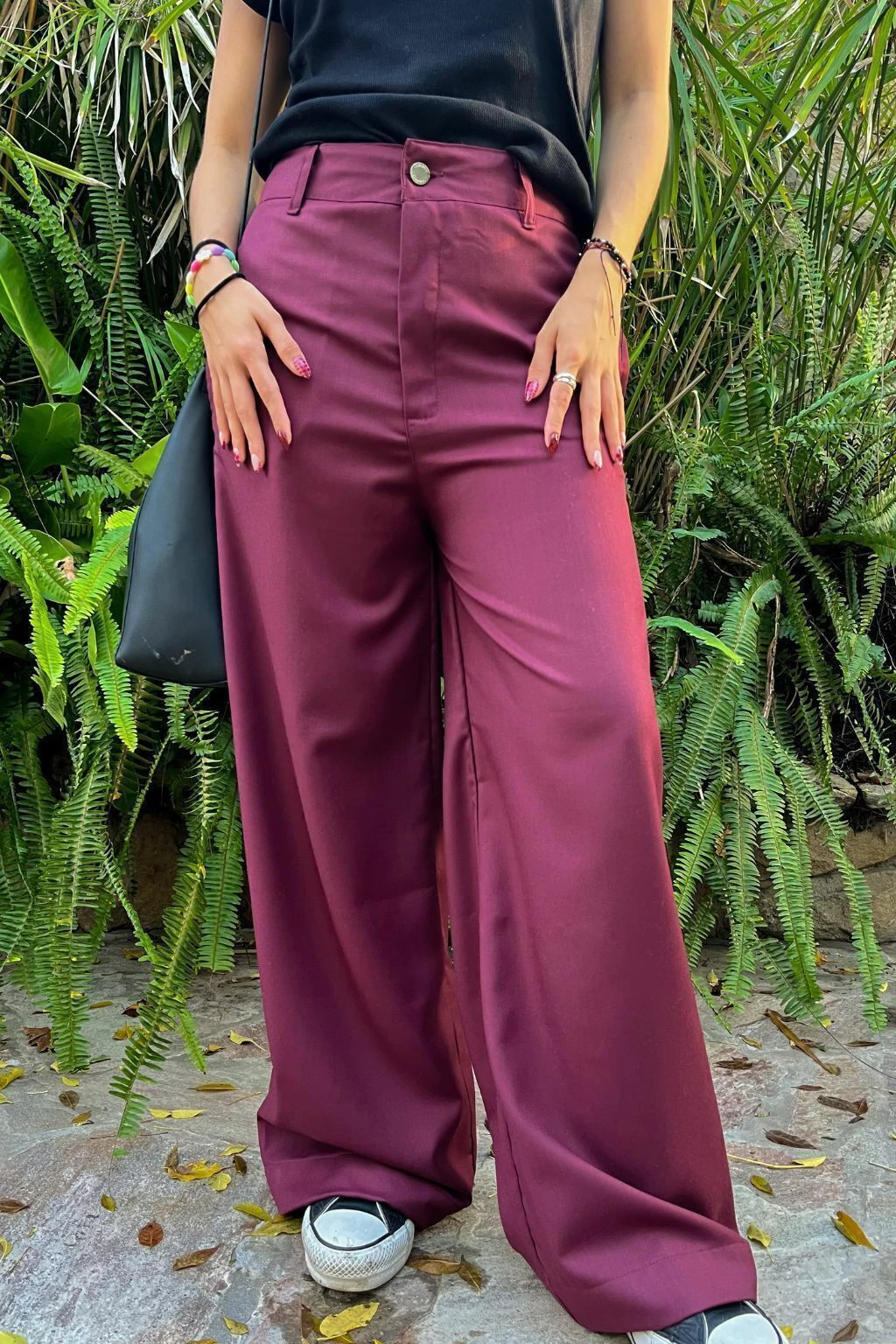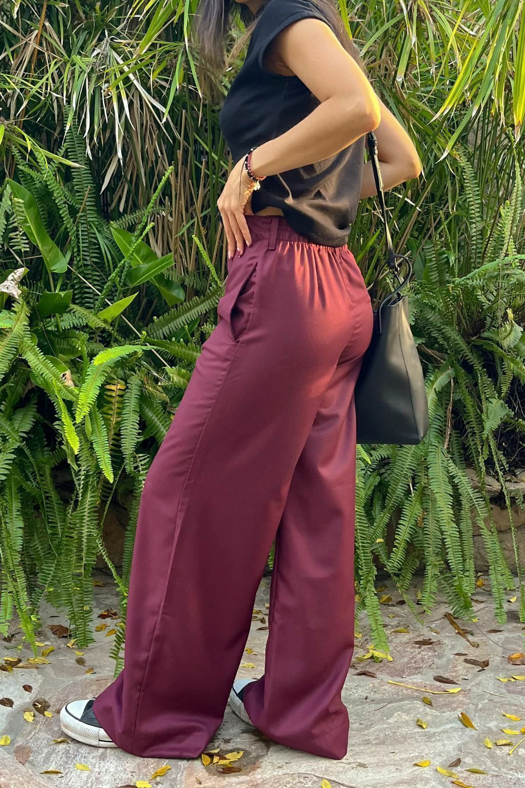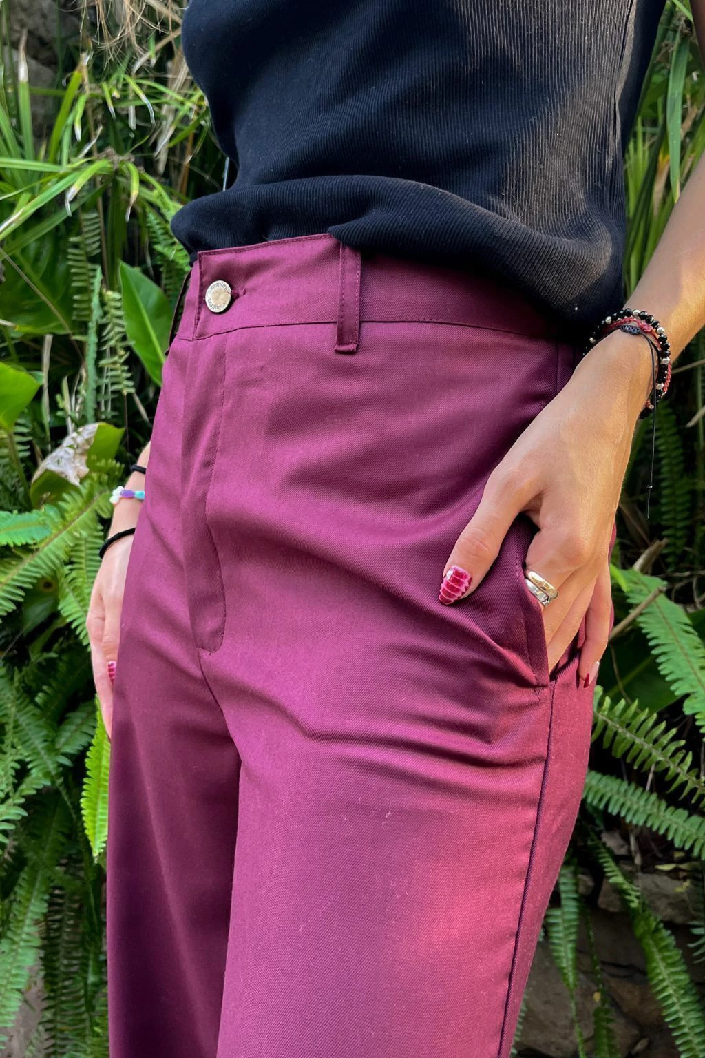 Estás conociendo nuestro producto estrella, el que fabricamos hace años, todas las temporadas! Si te lo llevas, lo vas a querer en todos los colores! Pantalón de tela sastrera (70%pol, 30%rayón) corte recto y ancho. Bolsillo falso en espalda y elástico en la cintura de la espalda. Botón de zamak con logo de marca y cierre YKK semiautomático de bronce. Tela color bordeaux OSCURO, tipo borgoña. En la foto se está utilizando un TALLE S. Bolsillos amplios en delantero.