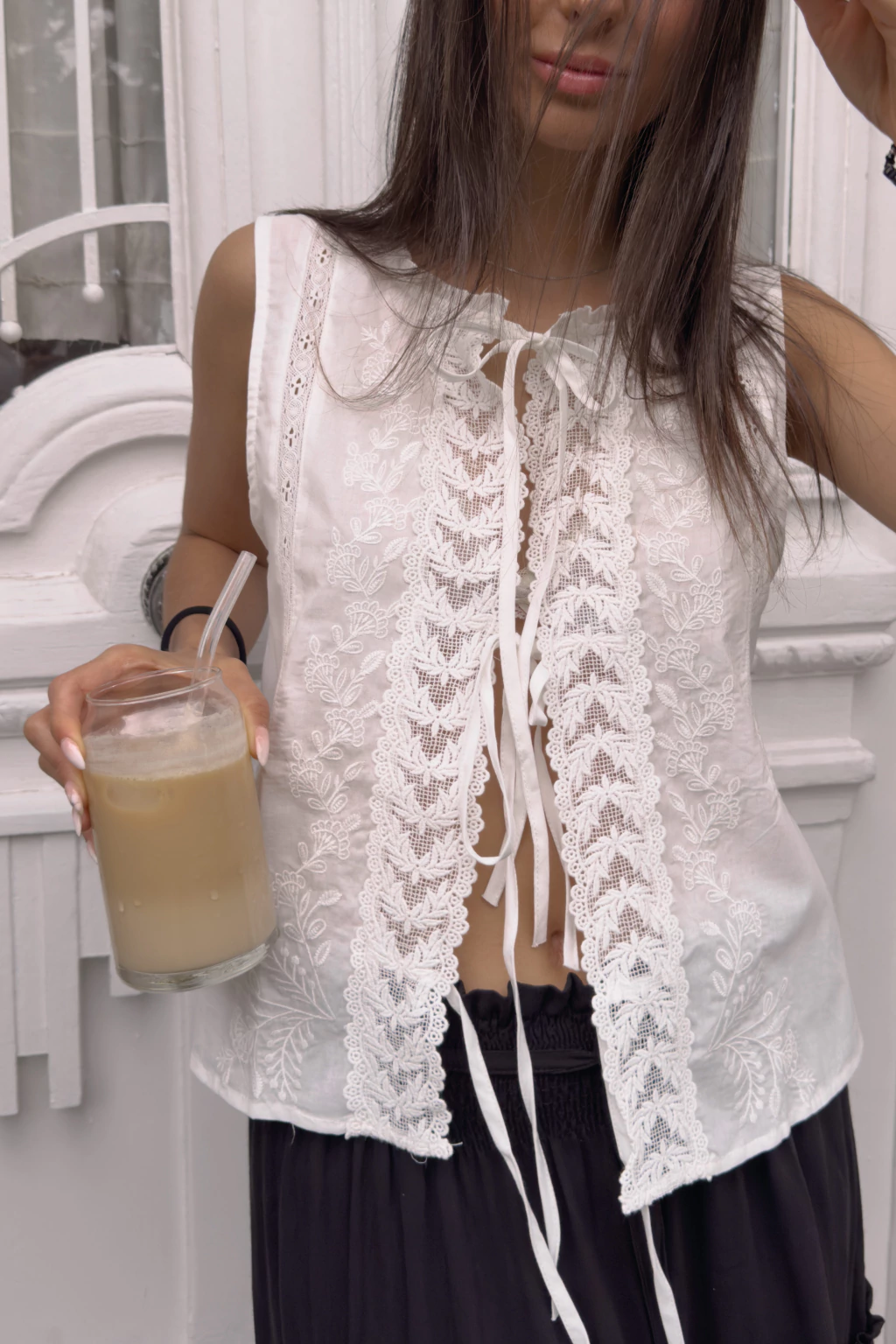 Blusa musculosa de poplín con puntillas y tiras para atar en delantero.