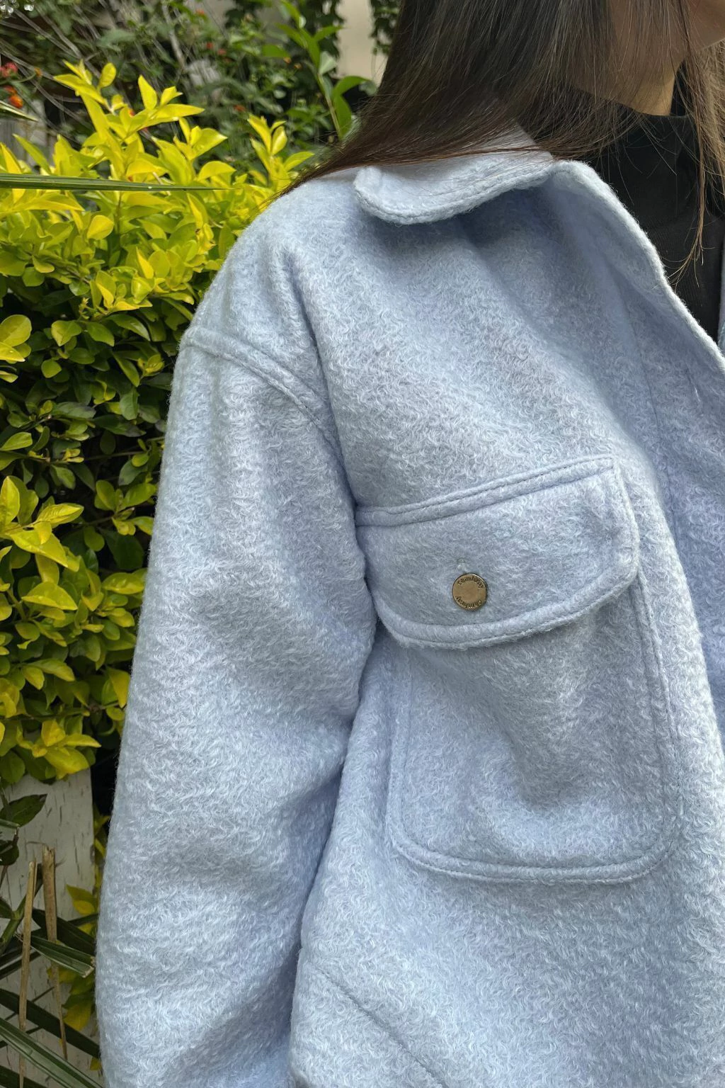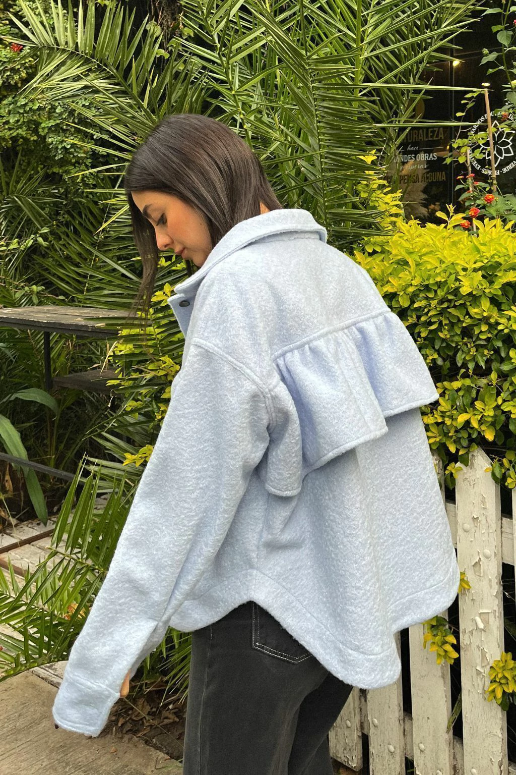 Nuestro amado camisaco, temporada tras temporada! Increíblemente abrigado. Abrigo camisaco de paño bouclé color celeste pastel. Con botones peltre y dos bolsillos delanteros. Detalle de botones de marca Cambray de Zamak color peltre en bolsillos. Volado en espalda que le da el toque canchero y distinto que necesitabas en tu look! No contiene forrería.