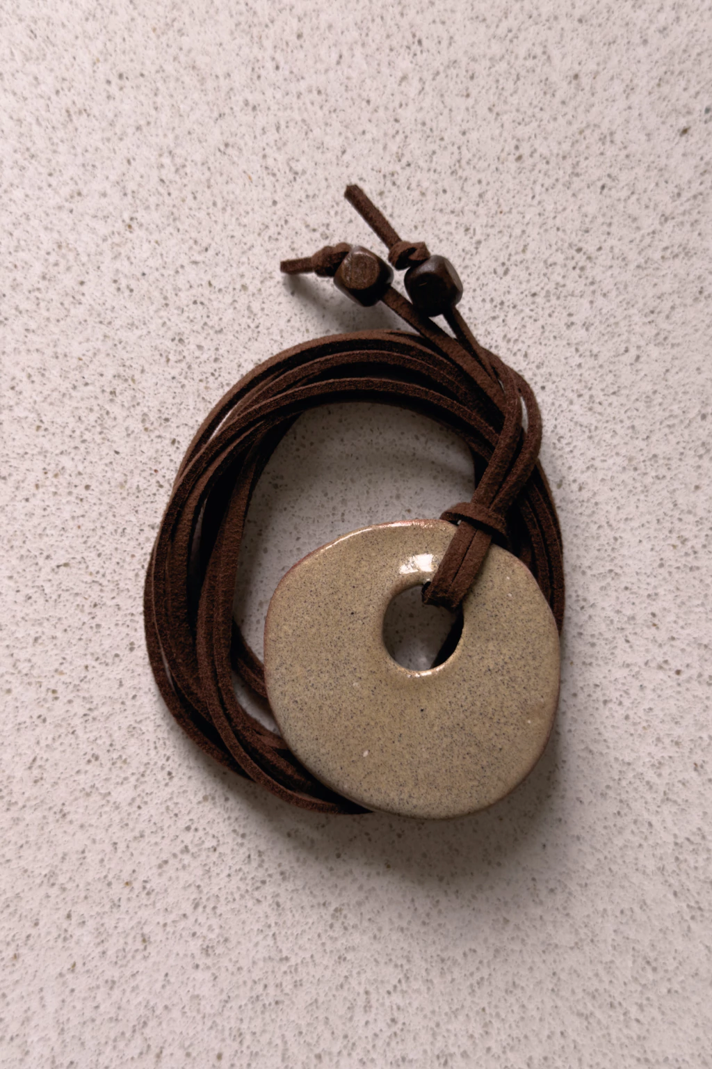 Collar con dije de cerámica hecho a mano beige jaspeado, con tira de gamuza color chocolate, pieza exclusiva!