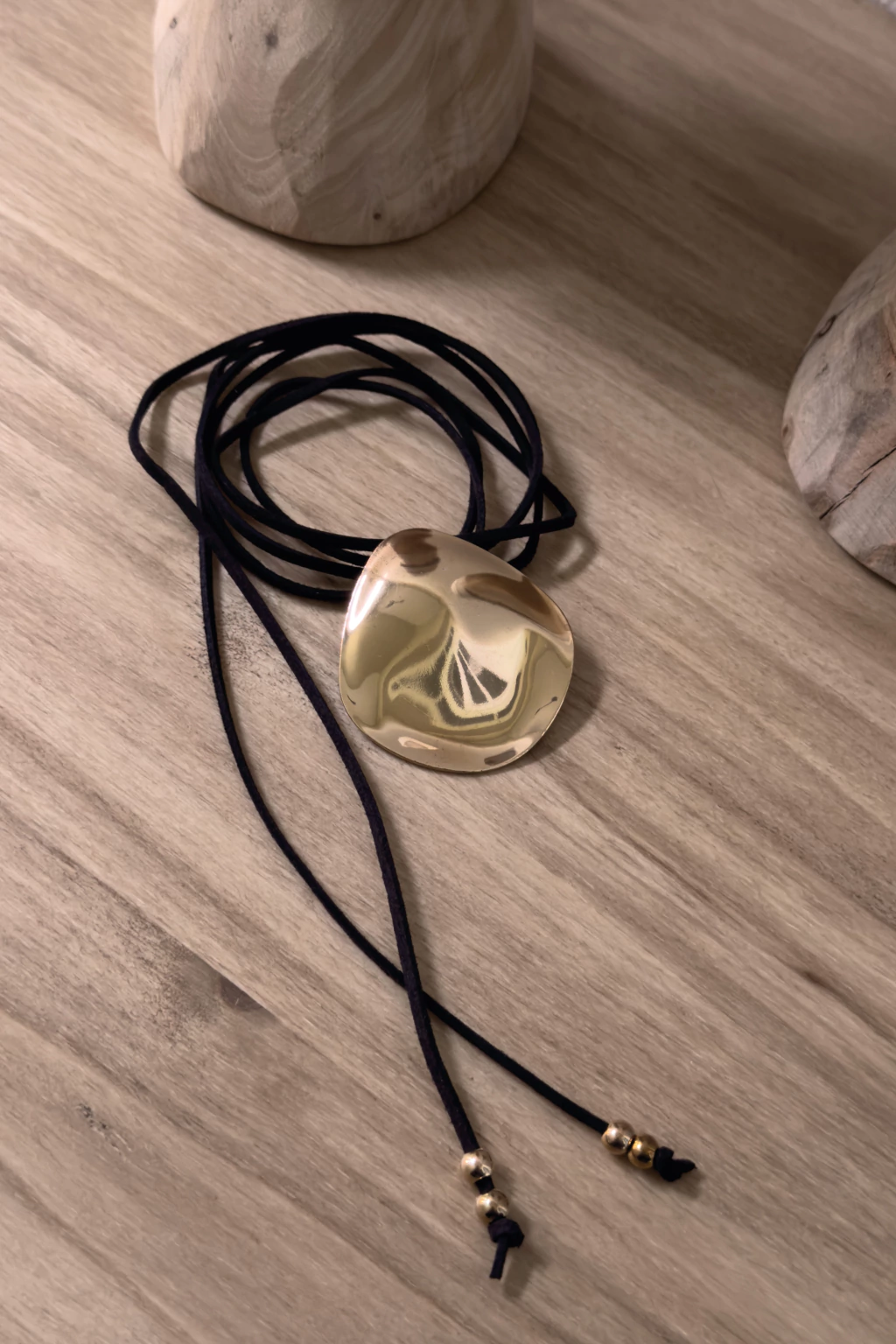 Collar con dije dorado de fantasía. Tira de gamuza color negro.