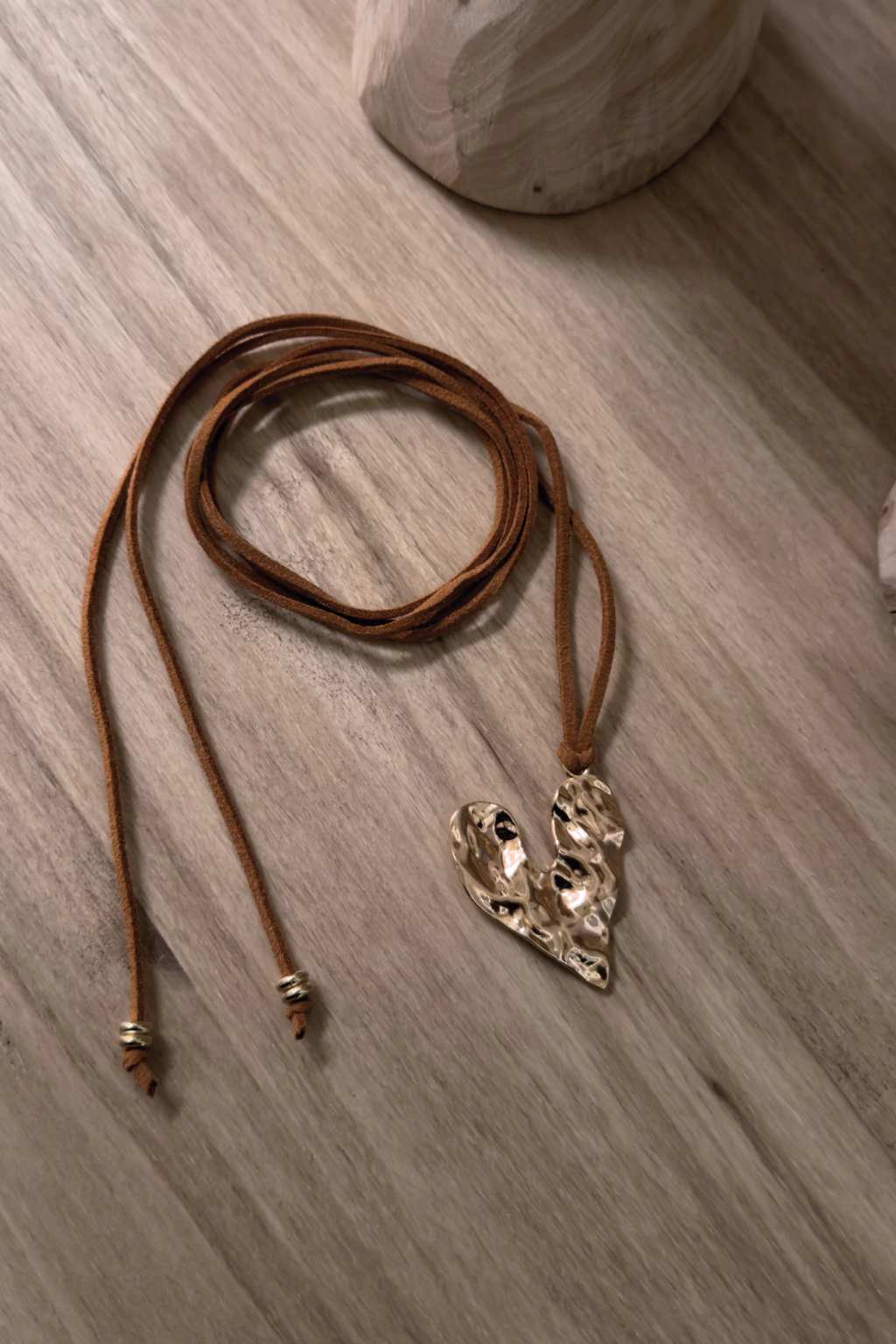 Collar con dije de fantasía, forma de corazón con textura. Tira de gamuza color camel