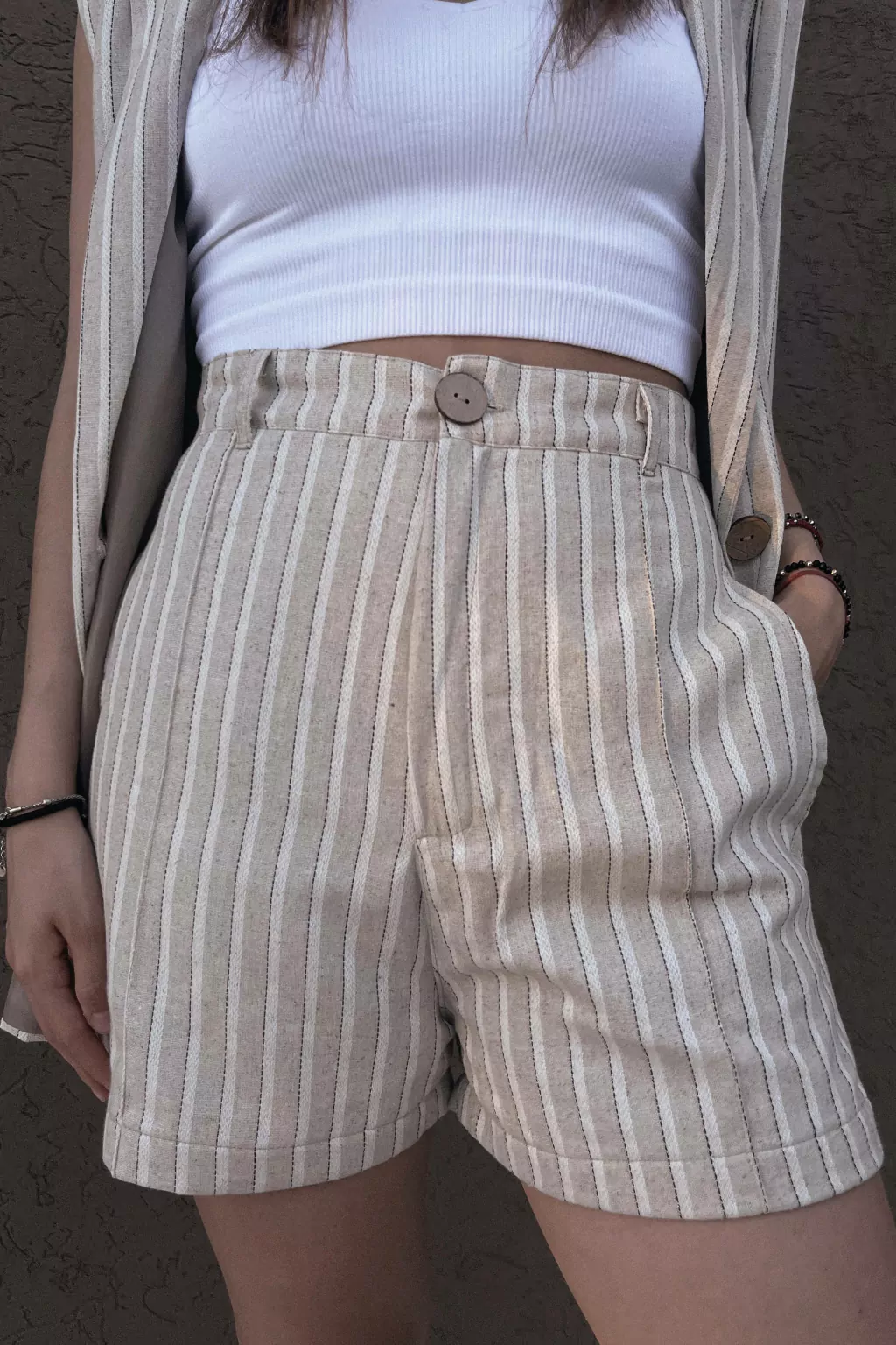 Short sastrero tiro alto de lino con detalles en lurex negro, forrado con lino. Bolsillos laterales. Cierre YKK de bronce y botón de coco. Pequeñas pinzas delanteras.