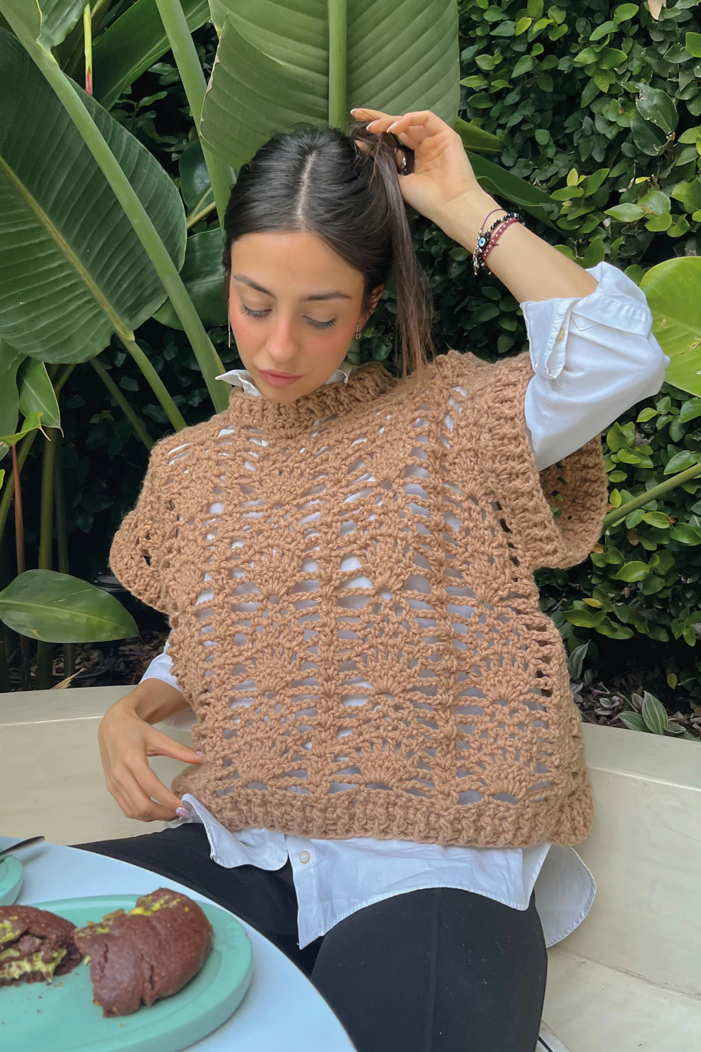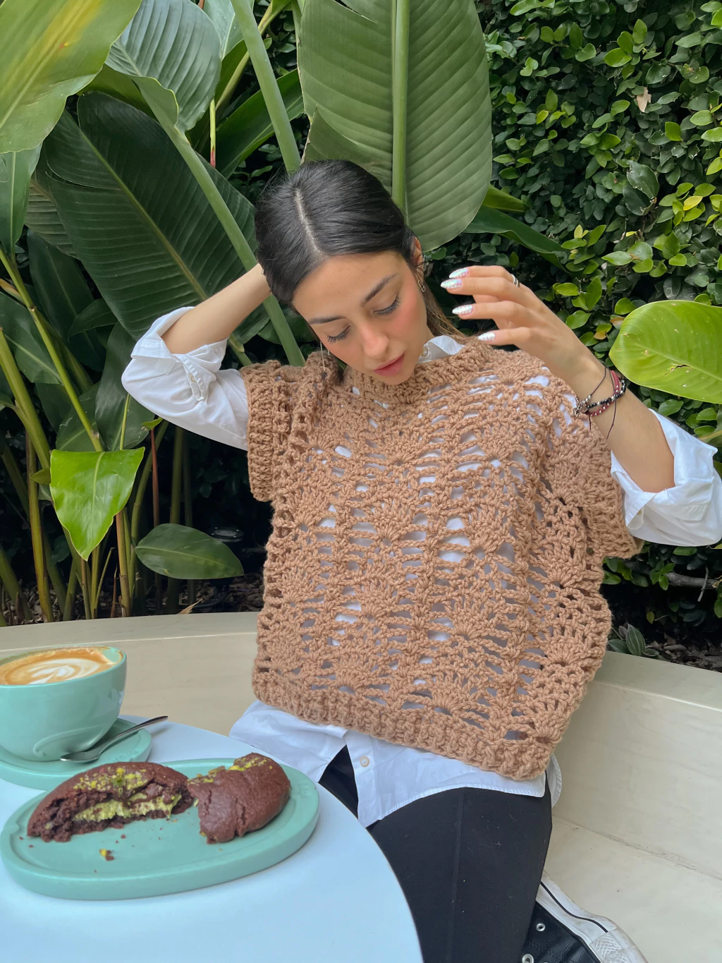 Pieza tejida a mano en crochet, con mucho amor para vos! Sweater chaleco manga corta con cuello redondo, color camel. Corte tipo "crop". Tejido en lana acrílica.