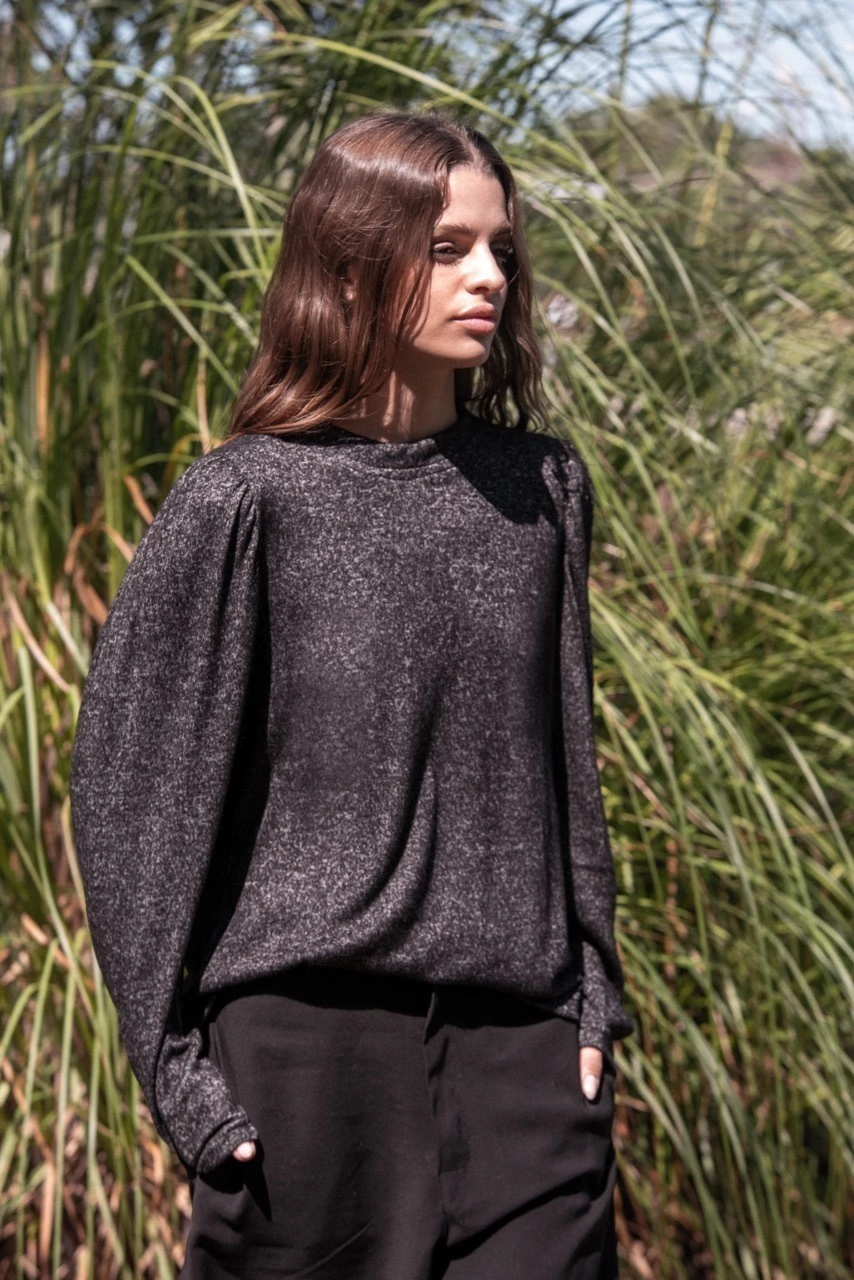 Sweater con mangas fruncidas, confeccionada en un tejido elastizado (78% RYN, 18%POL, 4%SPX). Color negro melange.